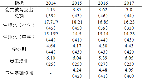 从表4可以看出,中国在人才教育体系结构改善方面进步较快,中、小学生师比,学徒制和员工培训等方面的排名都有所上升;在教育投入方面仍稍显滞后,2016年(46)较2014(39)年下滑7位,2017年略为回升(44),但较总体排名(40)仍是表现落后的指标。卫生基础设施情况排名有所上升,预示我国的教育环境有所改善,这也是近年来国家教育投资的重点区域。对比分析结果提示:中国在人才的投入与发展上,缺乏稳定的提升态势。持续加大人才培养的投入力度与教育质量,是中国人才队伍建设的关键。